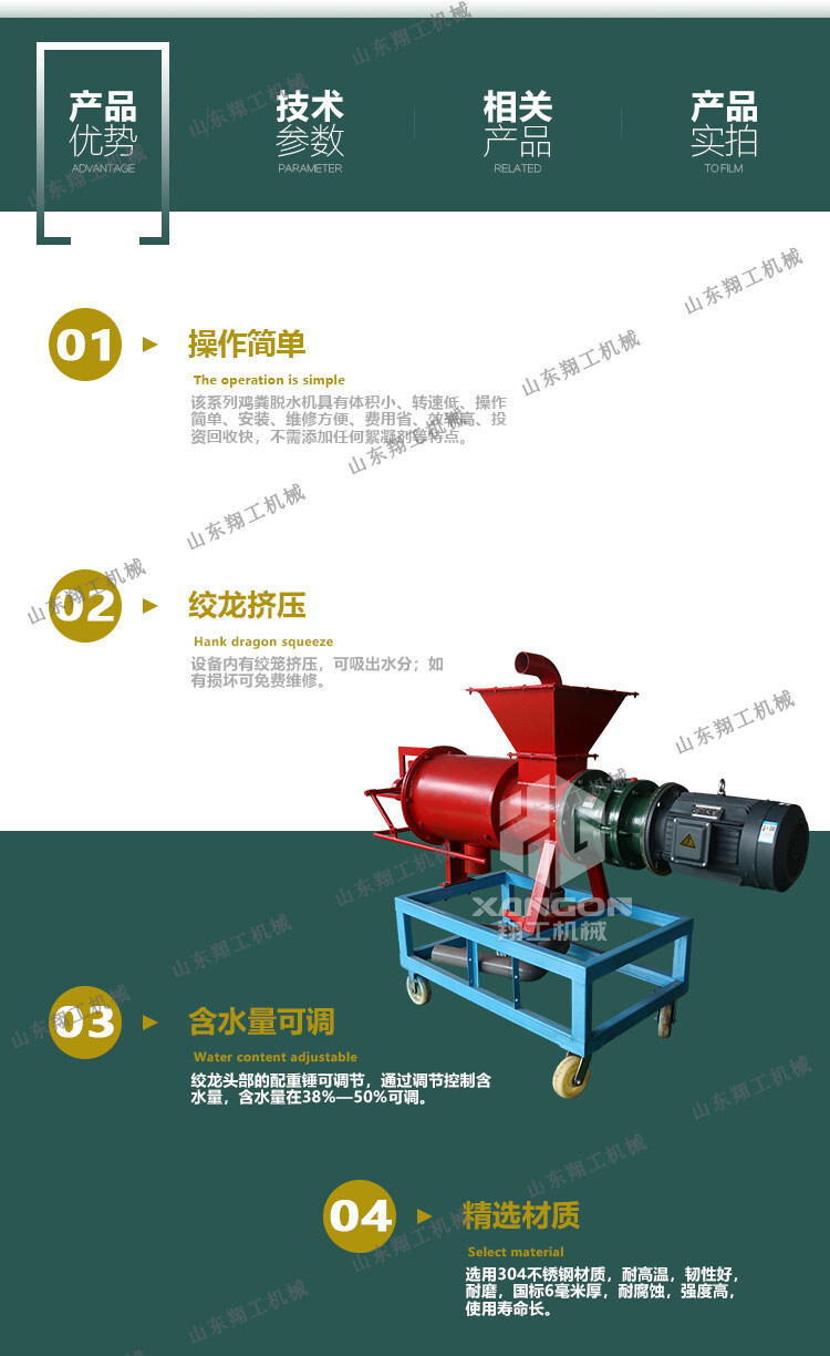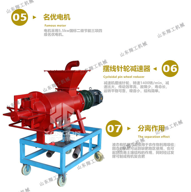 該系列雞糞脫水機具有體積小、轉(zhuǎn)速低、操作簡單、安裝、維修方便、費用省、效率高、投資回收快,不需添加任何絮凝劑等特點;該機采用的螺旋軸、篩網(wǎng)為不銹鋼制作;禽畜類糞便處理機能將雞糞、牛糞、豬糞等禽畜糞便原糞水分離為液態(tài)有機肥和固態(tài)有機肥;液態(tài)有機肥可直接用于農(nóng)作物利用吸收;固態(tài)有機肥可運到缺肥地區(qū)使用,也可起到改觀土壤結(jié)構(gòu)的作用,同時經(jīng)過處理可制成有機復(fù)合肥。