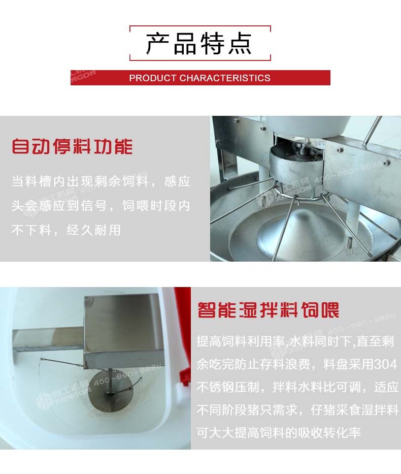 5.智能濕拌料飼喂,提高飼料利用效率。水和料同時(shí)下,在料盤內(nèi)混合成適口性 較好的濕直到剩余飼料被小豬吃完,防止料槽內(nèi)存料過多造成浪費(fèi)。料盤采用304不銹鋼整體壓制,拌料,水料比可調(diào)節(jié),以適應(yīng)不同階段的豬只需求。仔豬采食濕拌料可以大大提高飼料的吸收轉(zhuǎn)化效率。