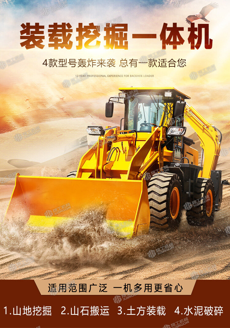 挖掘裝載一體機(jī)俗稱(chēng)“兩頭忙”。因?yàn)樗哂歇?dú)特的構(gòu)造,前端是裝載裝置,后端為挖掘裝置。在工地內(nèi),您只需要轉(zhuǎn)動(dòng)一下座椅,即可完成從裝載機(jī)到挖掘機(jī)操作手角色的轉(zhuǎn)變?!皟深^忙”屬于小型多功能工程機(jī)械的一種,一般在大工程完成后的小工程中使用。它可配多種工作裝置及輔具,進(jìn)行挖掘、鏟裝、路面破碎、平整場(chǎng)地、開(kāi)挖溝渠、鋪設(shè)管道等多種作業(yè)。
