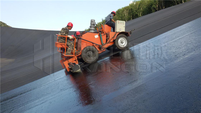 瀝青封閉層的施工采用適合于斜坡施工的專用瀝青瑪蹄脂涂刷機,在牽引臺車的牽引下沿著面板從下往上涂刷。涂刷完一個條帶后,將涂刷機移動至下一個條帶繼續(xù)涂刷。瑪蹄脂封閉層涂刷作業(yè)時環(huán)境氣溫應在10℃以上,涂刷溫度一般在170℃~190℃;施工完成的封閉層表面禁止無關人員和機械行走;特殊部位:壩頂及曲率半徑較小的圓弧斷,采用小型機械涂刷方式進行機械涂刷進行,環(huán)庫水平段及弧段全部采用小刮涂機配合人工進行刮涂施工。